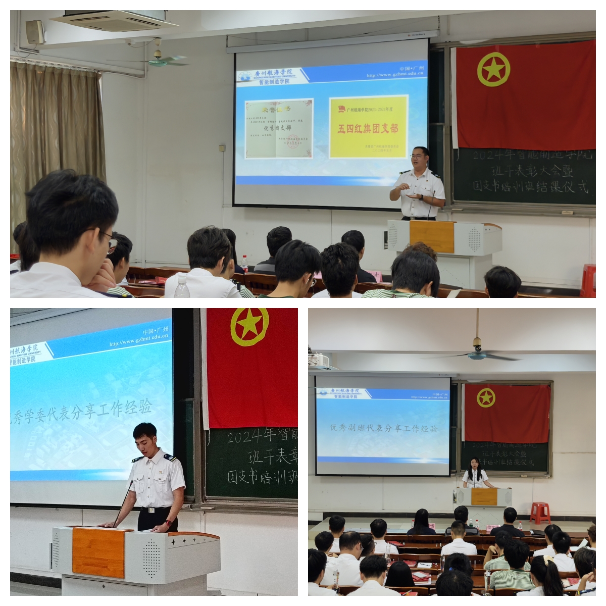 随后,张志斌、谭文才和林恬恬三位老师分别为优秀团支书、优秀副班、优秀学委颁发荣誉证书。优秀学委代表李敏彦、优秀副班代表蓝静和优秀团支书代表侯成珠三位同学依次上台分享班级管理方法和工作经验,为其他班干部带来了宝贵的学习契机。