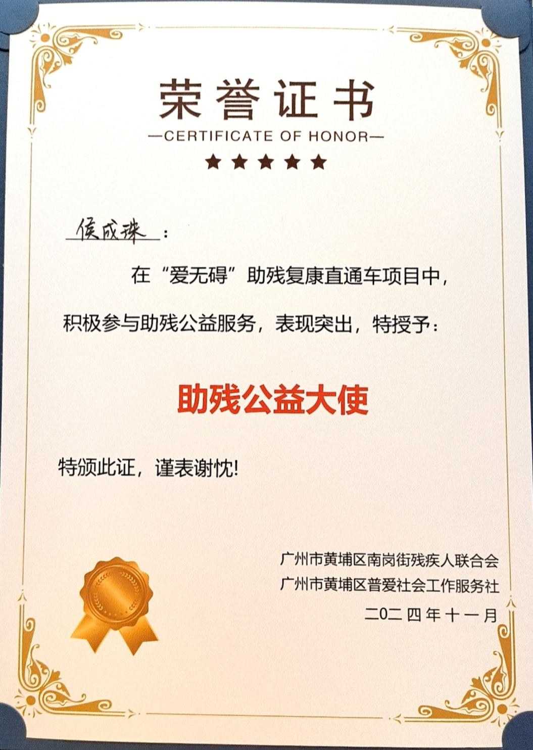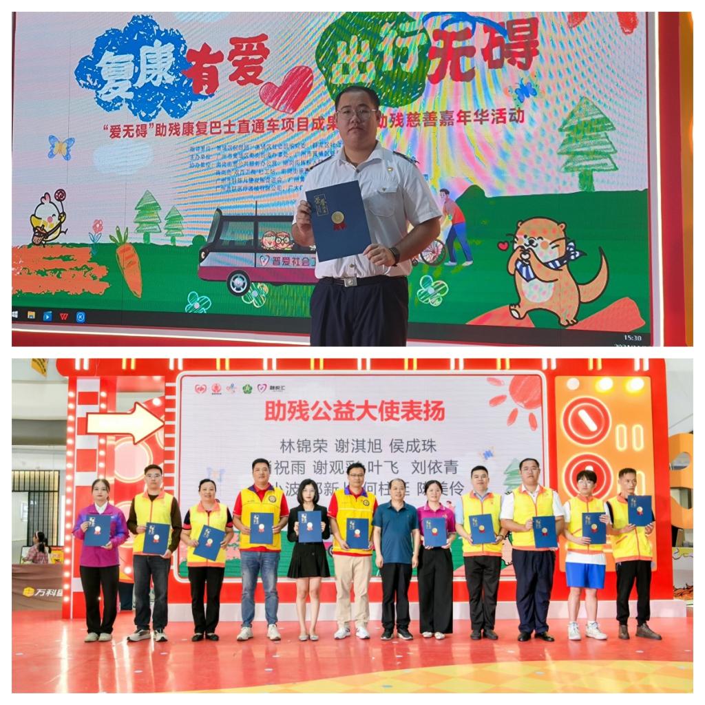 11月10日,由广州市黄埔区南岗街道办事处、黄埔区普爱社会工作服务社共同举办的“复康有爱·出行无碍”为主题的“爱无碍”助残复康巴士直通车项目成果展暨慈善嘉年华活动在南岗街融悦汇广场盛大举行。bevictor伟德官网侯成珠同学在活动中被授予“助残公益大使”荣誉称号。