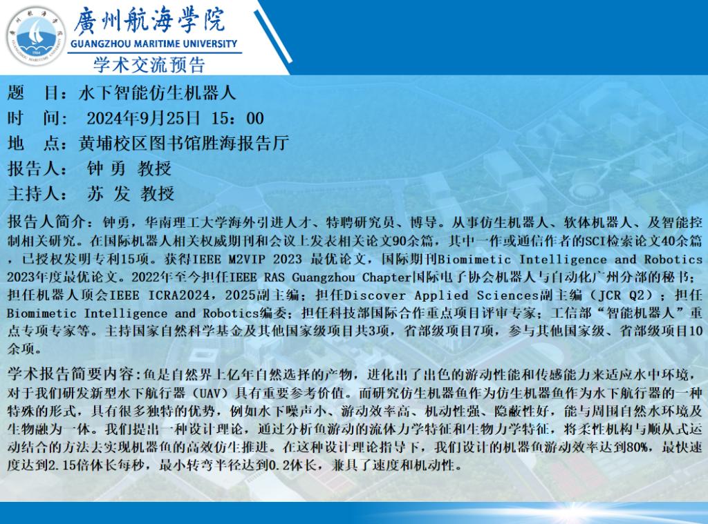 学术讲座预告:水下智能仿生机器人