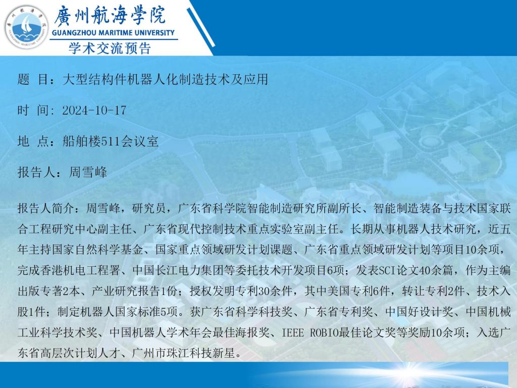 学术讲座预告:大型结构件机器人化制造技术及应用