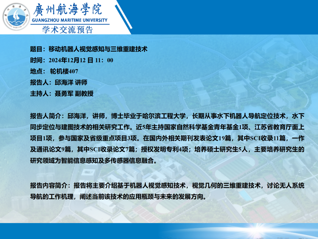 学术交流预告:移动机器人视觉感知与三维重建技术
