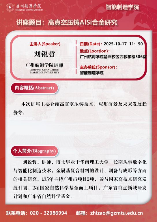 学术讲座预告:刘锐哲《高真空压铸AlSi合金研究》