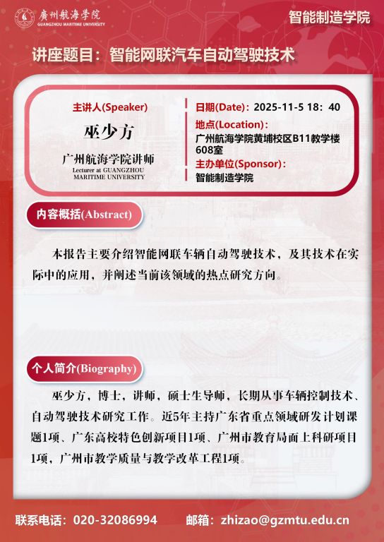 学术讲座预告:巫少方《智能网联汽车自动驾驶技术》